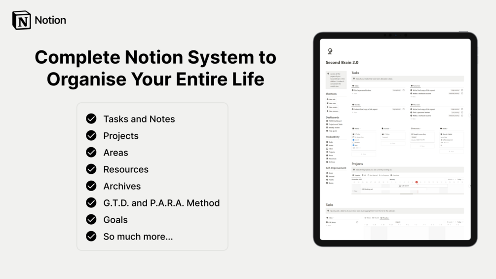 Notion Second Brain is the only system that allows you to track tasks, notes, projects, areas, resources, goals, and so much more, all in one beautiful system.
